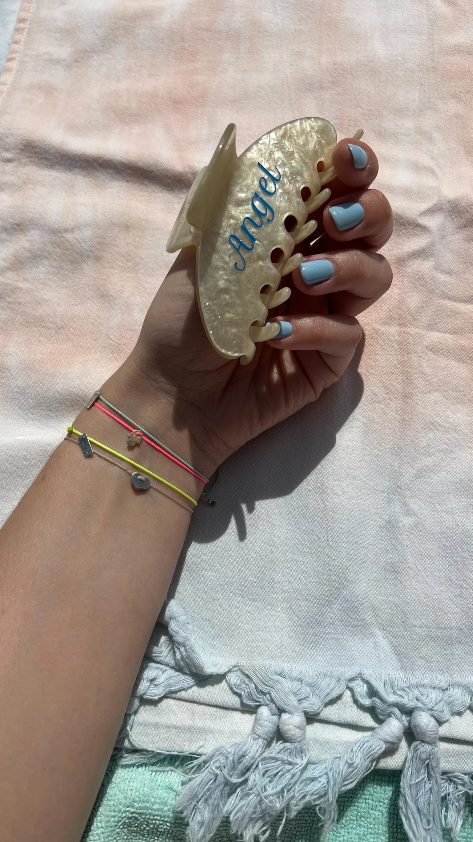 A glamorous marble look hair clip with a shiny gold touch and sky blue writing on one side.