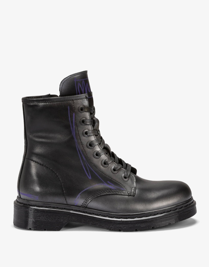 This black boot with the classic lacing is adorned by the fine painting in the shade of purple and the areas that were lightly sprayed silver - an absolutely special boot! The high tongue gives the look of the leather boots that certain something extra!