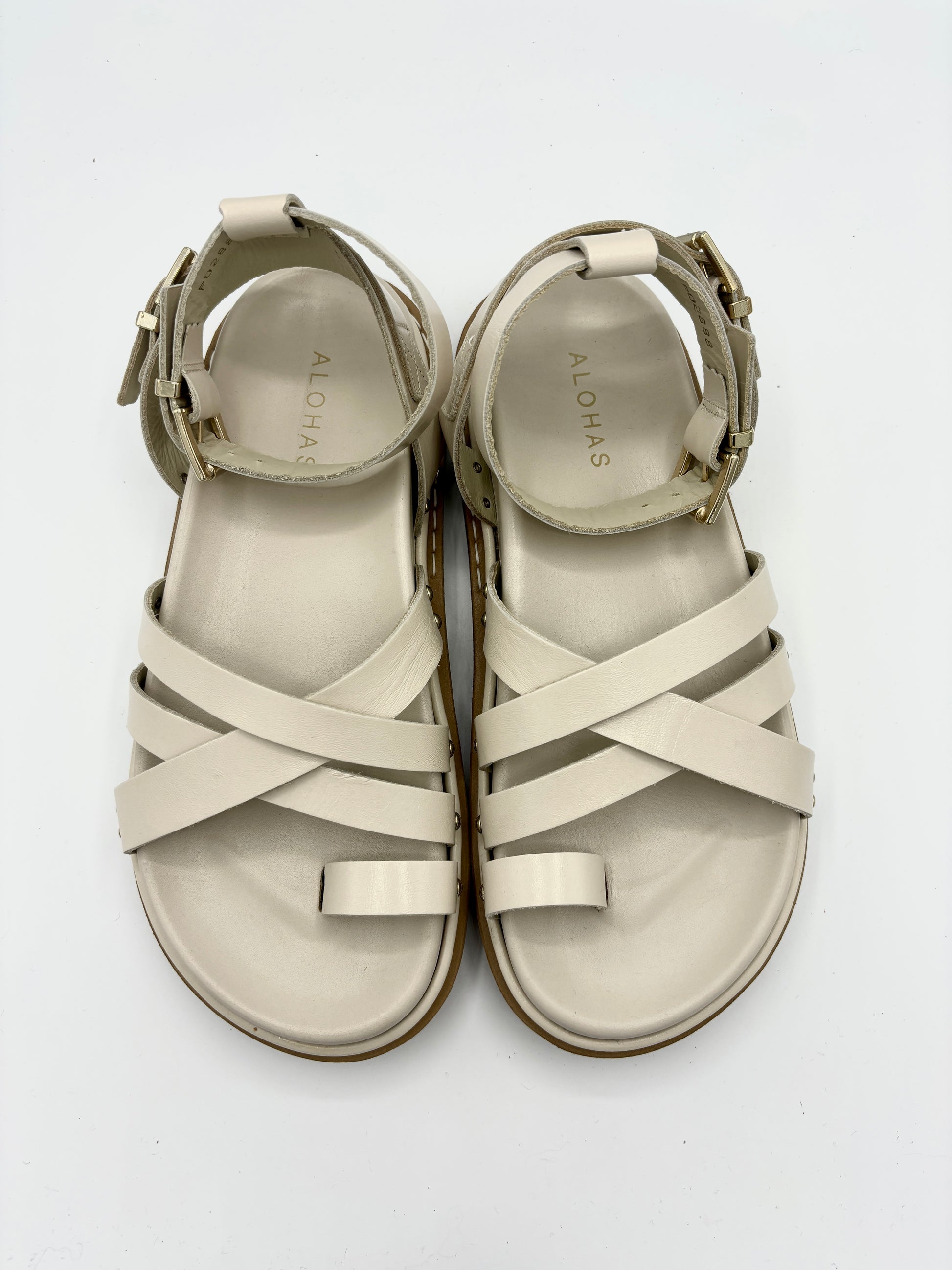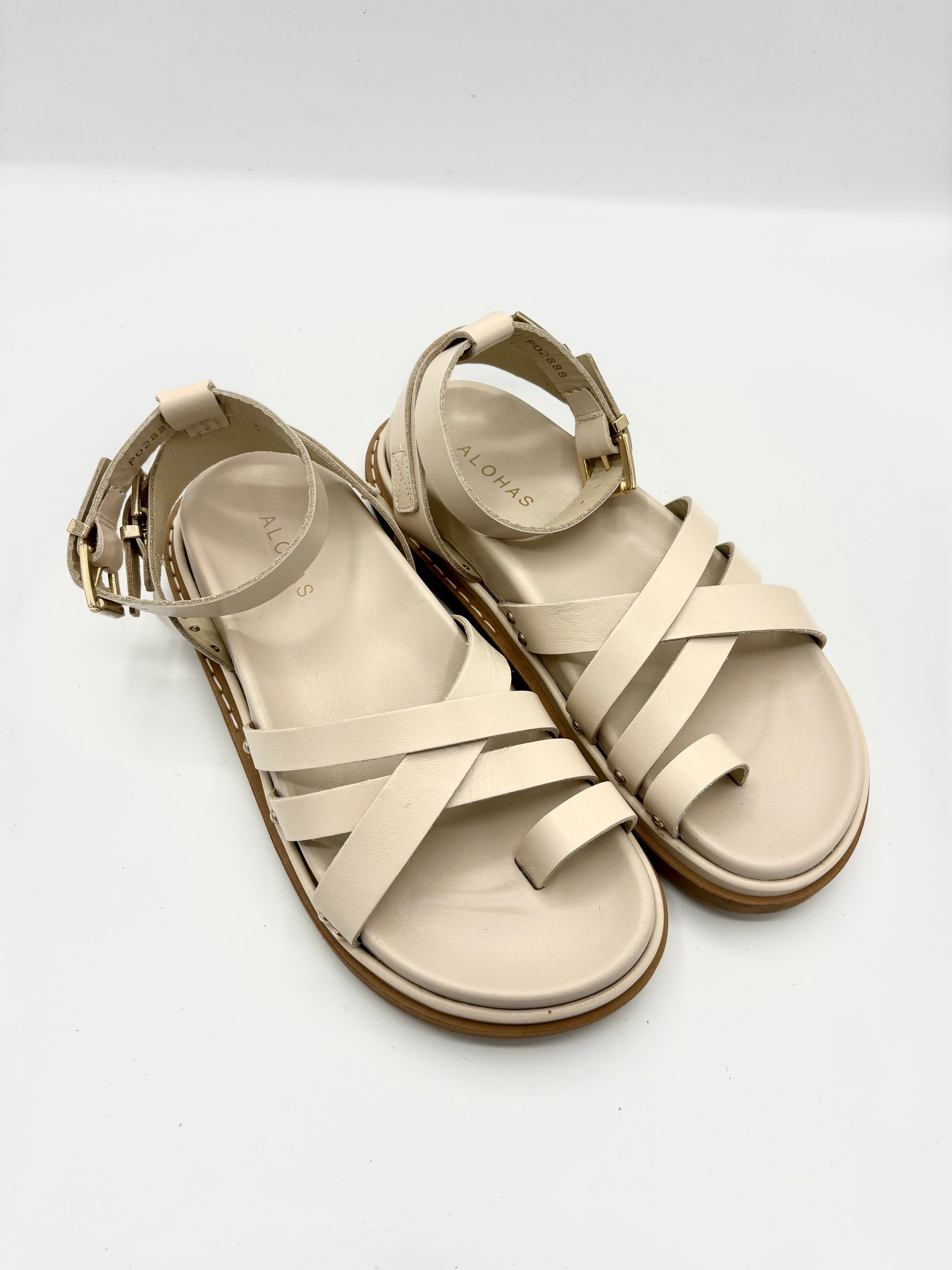 Die anatomische Silhouette der Sohle kombiniert mit einer starken goldenen Schnalle um den Knöchel und die gedoppelten Riemchen mit dem Zehenring machen diese Sandale von Alohas zu etwas ganz besonderem - ein wahnsinnig komfortables Tragegefühl und gleichzeitig ein schlichter und doch aufregender