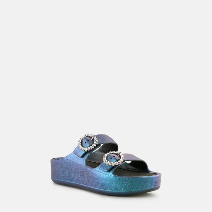 Die beigen Sommer-Slipper in der Special Edition mit einem feinen Glitzer-Finish, den zwei verstellbaren Riemen und der Plateau-Sohle, sind nicht nur wahnsinnig leicht und bequem, sondern auch aus hochwertigen veganen Materialien in Portugal hergestellt, mit saubeer Energie in der gesamten Produktion!