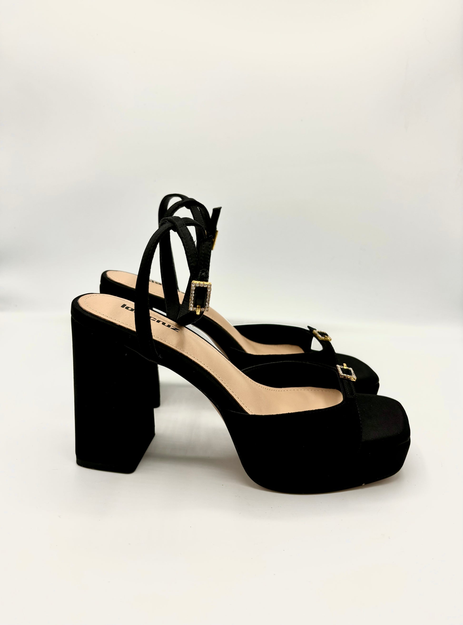 mit diesem wunderschönen Leder Plateau Schuh von Lola Cruz bist du definitiv der Hingucker des Abends! Die Kombination des edlen Satin Stoffs und den zarten Riemchen und Glitzerschnallen mit dem derberen Absatz zaubern einen richtig coolen Mix aus Schick und Trendy!