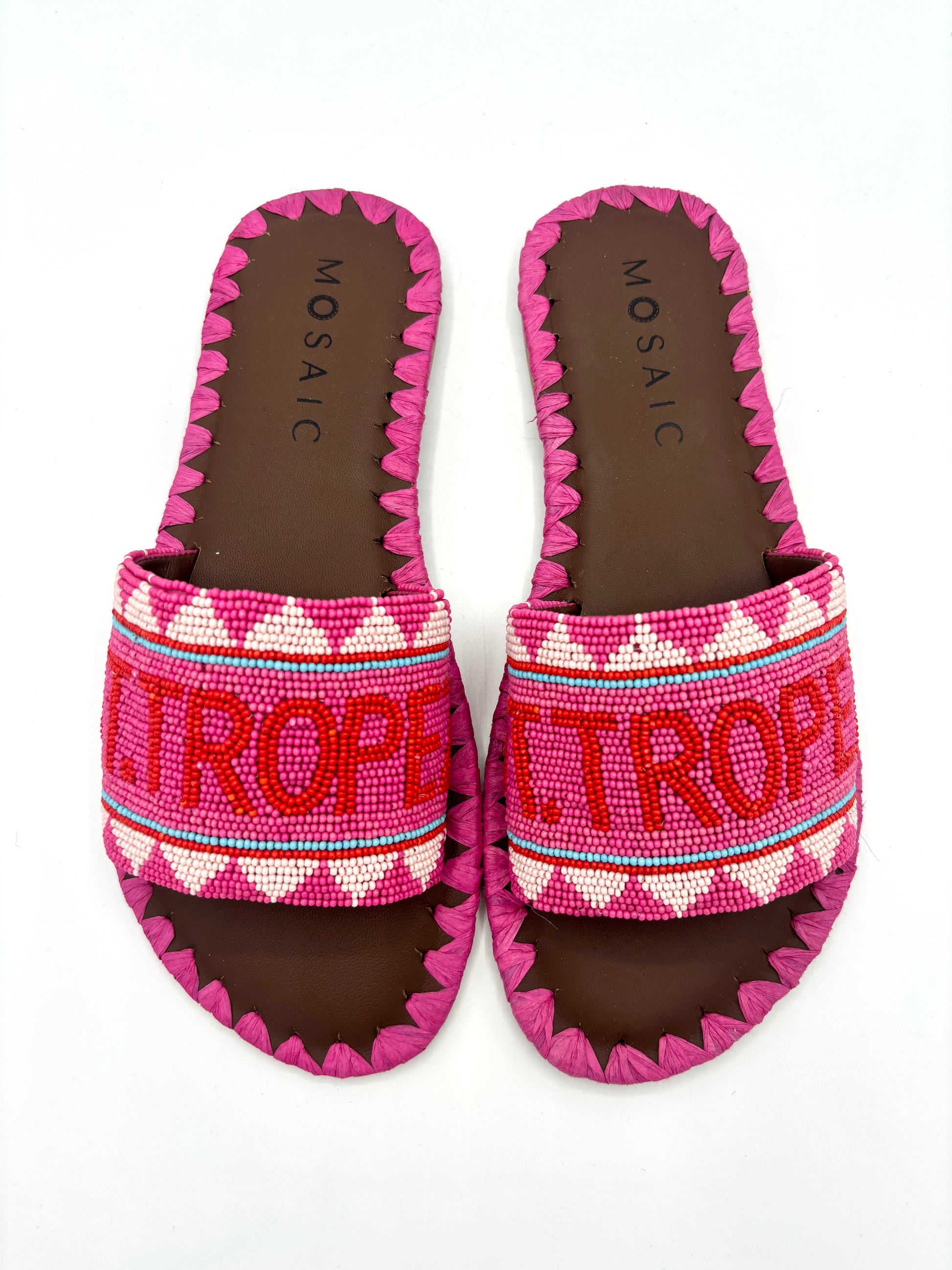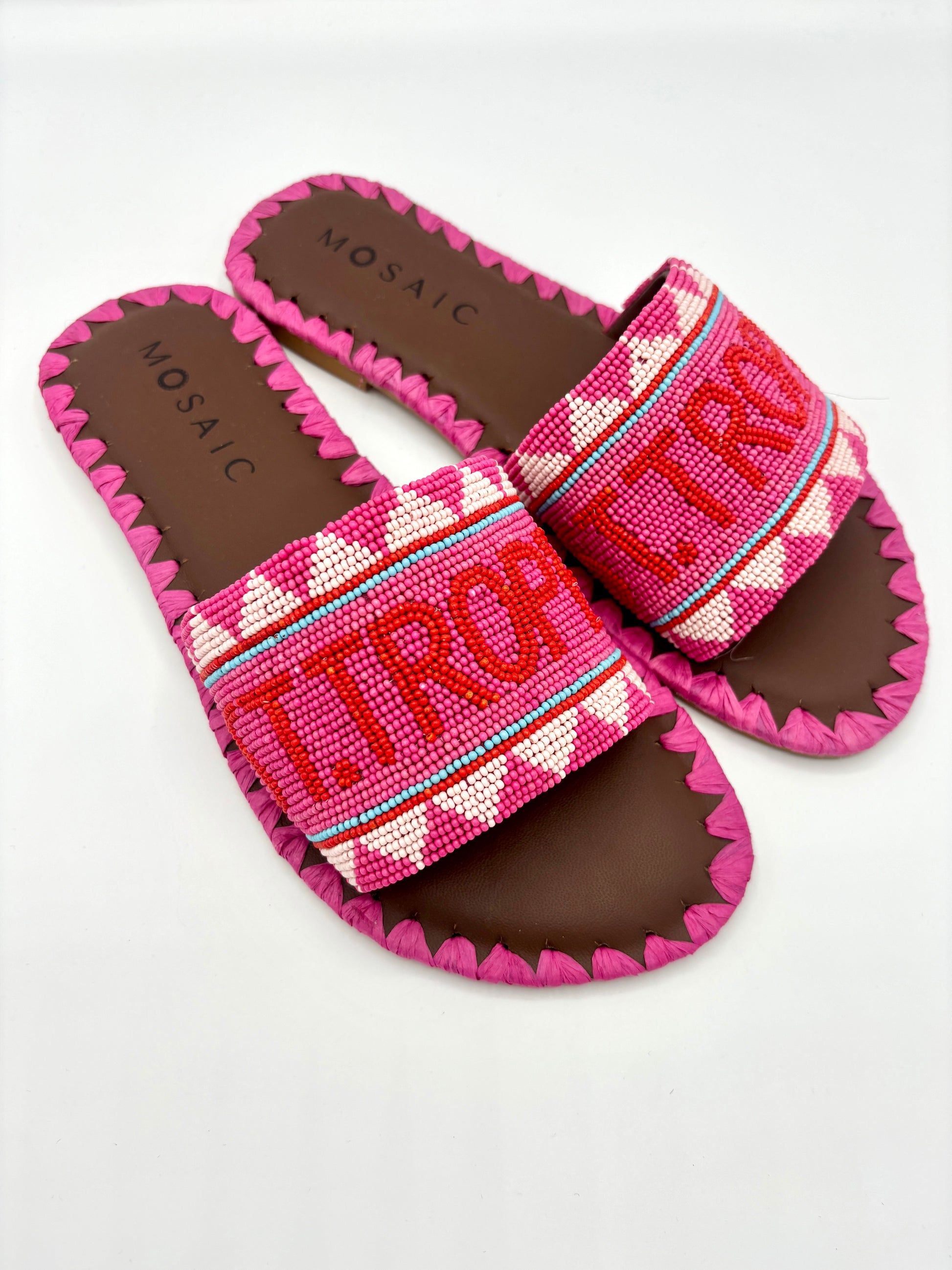 - Lebhafte Farben: Die pinken Straps sind mit einem kunstvollen Perlen-Design in Rot, Weiß und Pink verziert.