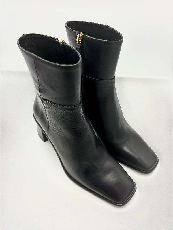 Ein komplett schwarzer Look, der Sie in den Bann zieht. Diese Lederstiefel von Alohas haben eine tiefschwarze Laufsohle und ein schillerndes goldenes Reißverschlussdetail.