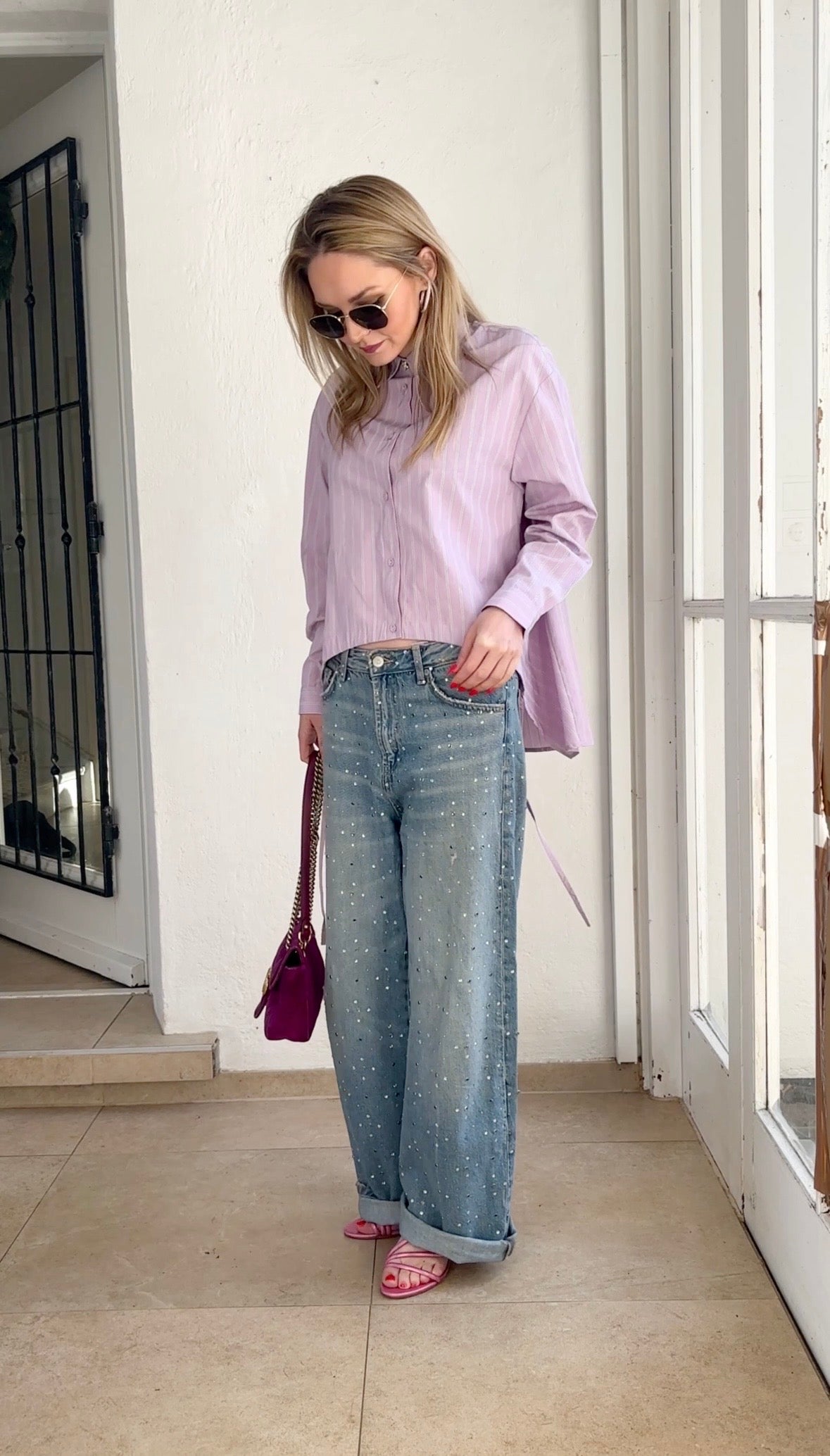 leichtes Hemd mit Streifen und Glitzer-Sternen an Manschetten und der Knopfleiste von Café Noir. Asymmetrisch geschnitten, hinten länger mit Bändern zum raffen und zuziehen