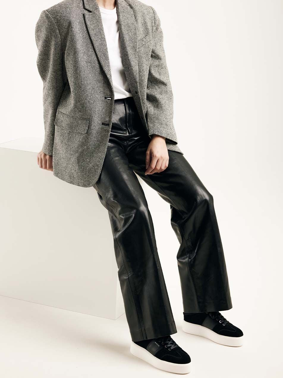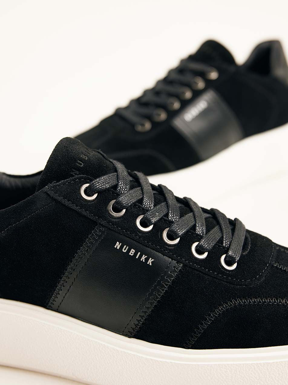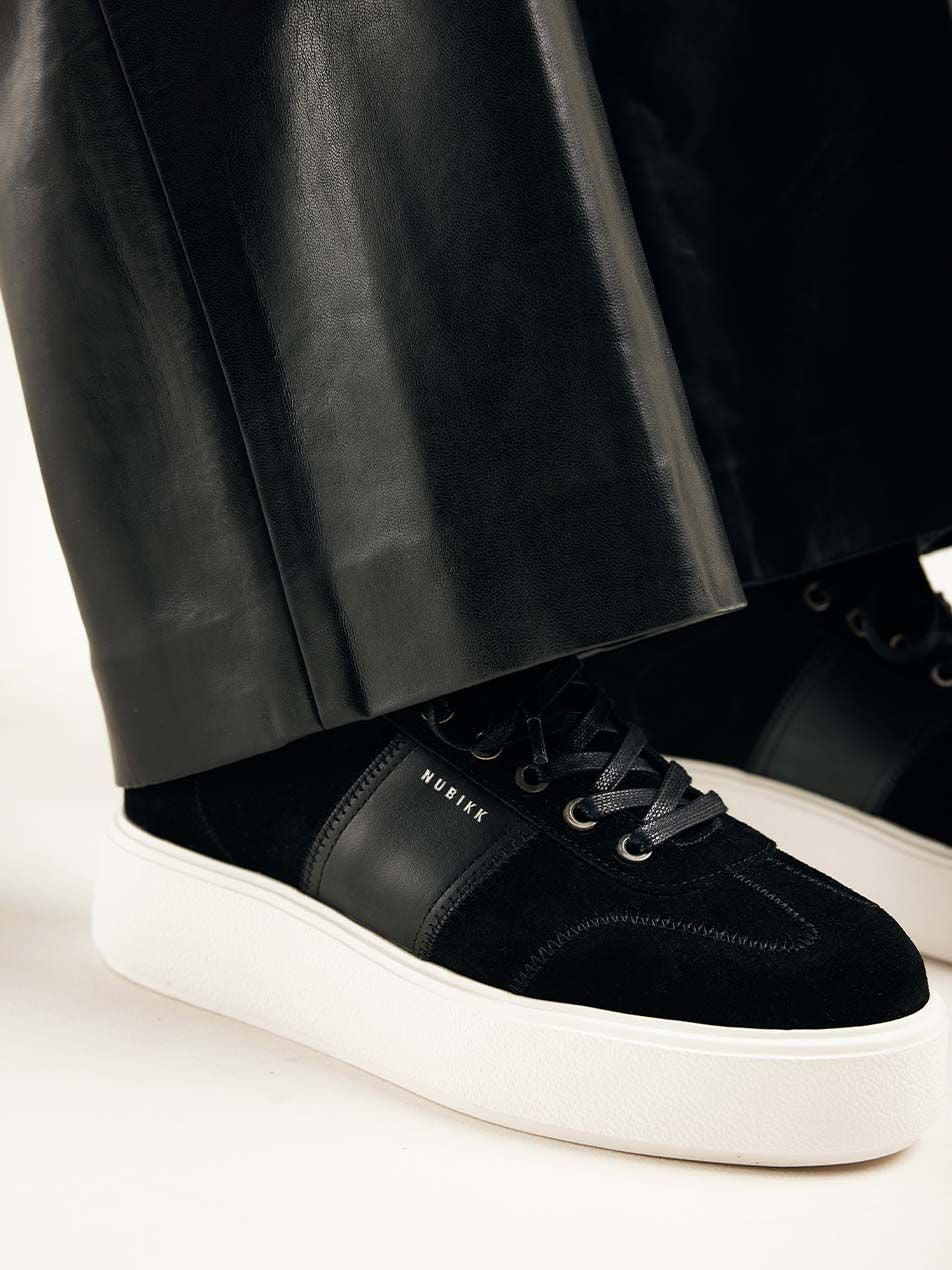 Der Elise Wing Platform Sneaker von Nubikk ist die perfekte Ergänzung zu jeder Garderobe. Dieser Sneaker ist aus hochwertigem Wildleder und Leder gefertigt und langlebig und bietet sowohl Stil als auch Komfort. Die schlanke schwarze Farbe verleiht jedem Outfit einen Hauch von Raffinesse und Vielseitigkeit.