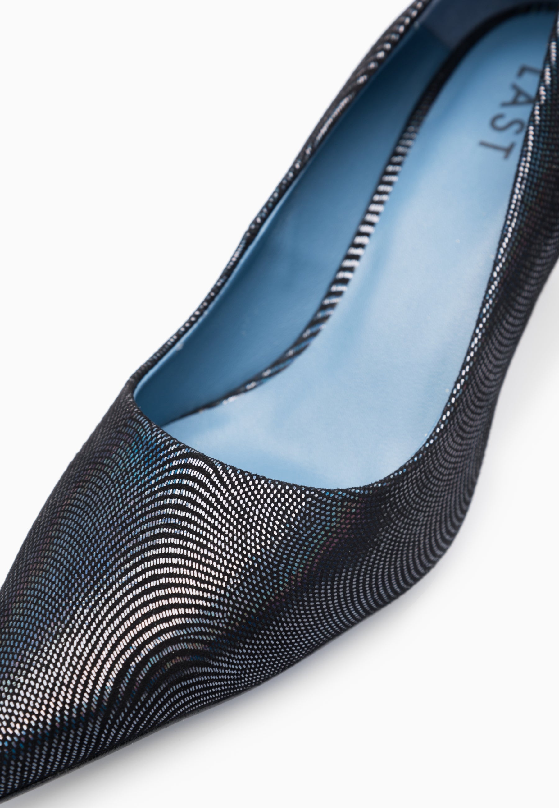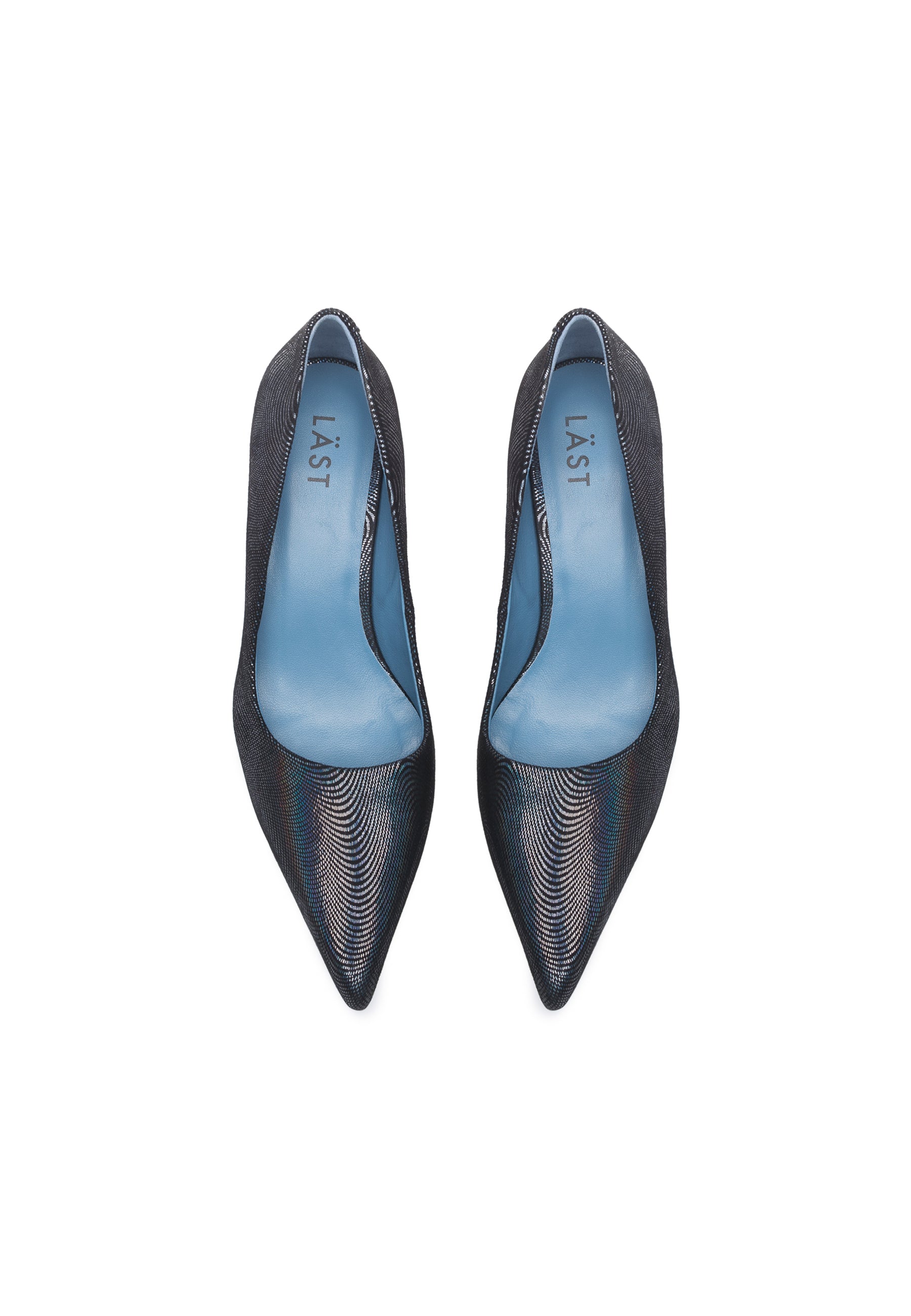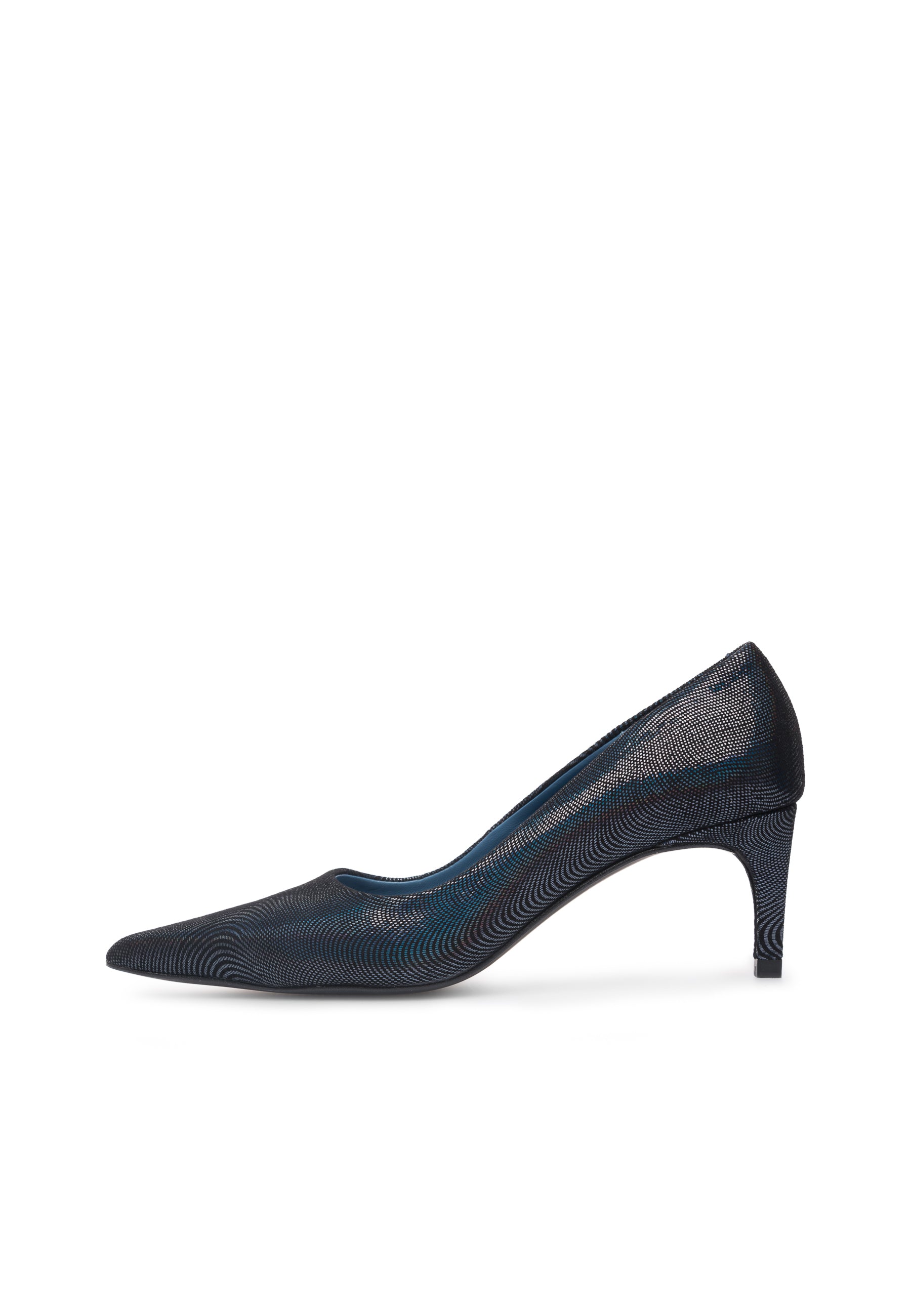 Der klassische Pump mit spitzer Zehe und einem bequemen, mittelhohen 6,5 cm Absatz ist mit feinem Ziegenleder überzogen. Das Besondere ist die schlangenähnliche Struktur im Hologram-Look, der im Licht in verschiedenen Farben schimmert!