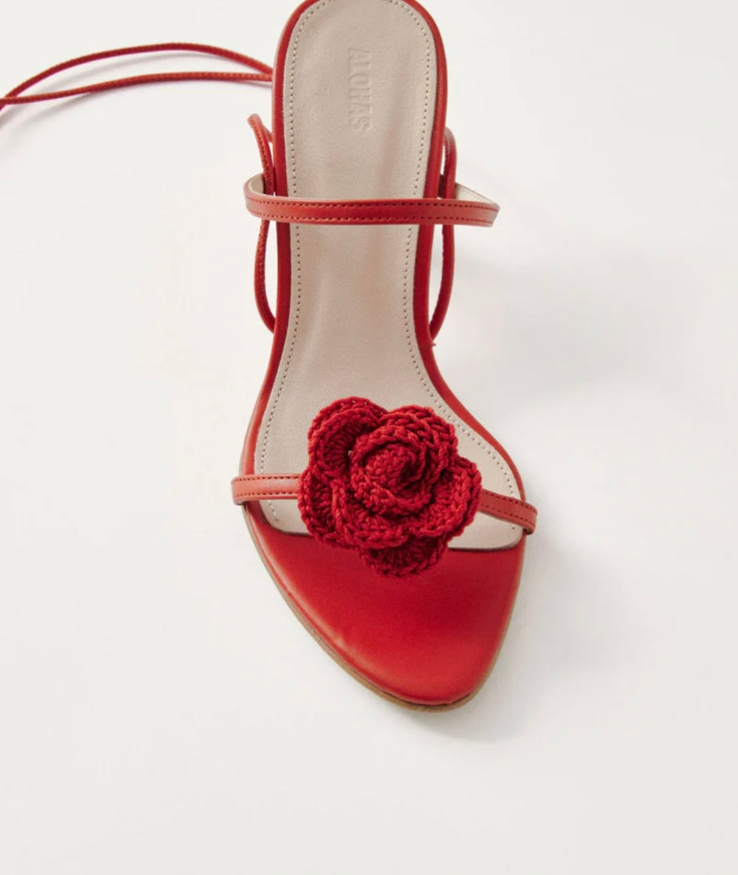 Die Kendra Bloom Sandale von ALOHAS ziert eine wunderschöne Blume aus Strick, die dem Heel einen romantischen Touch verleiht. Die zarten Lederriemchen lassen sich wunderschön um das Bein wickeln.