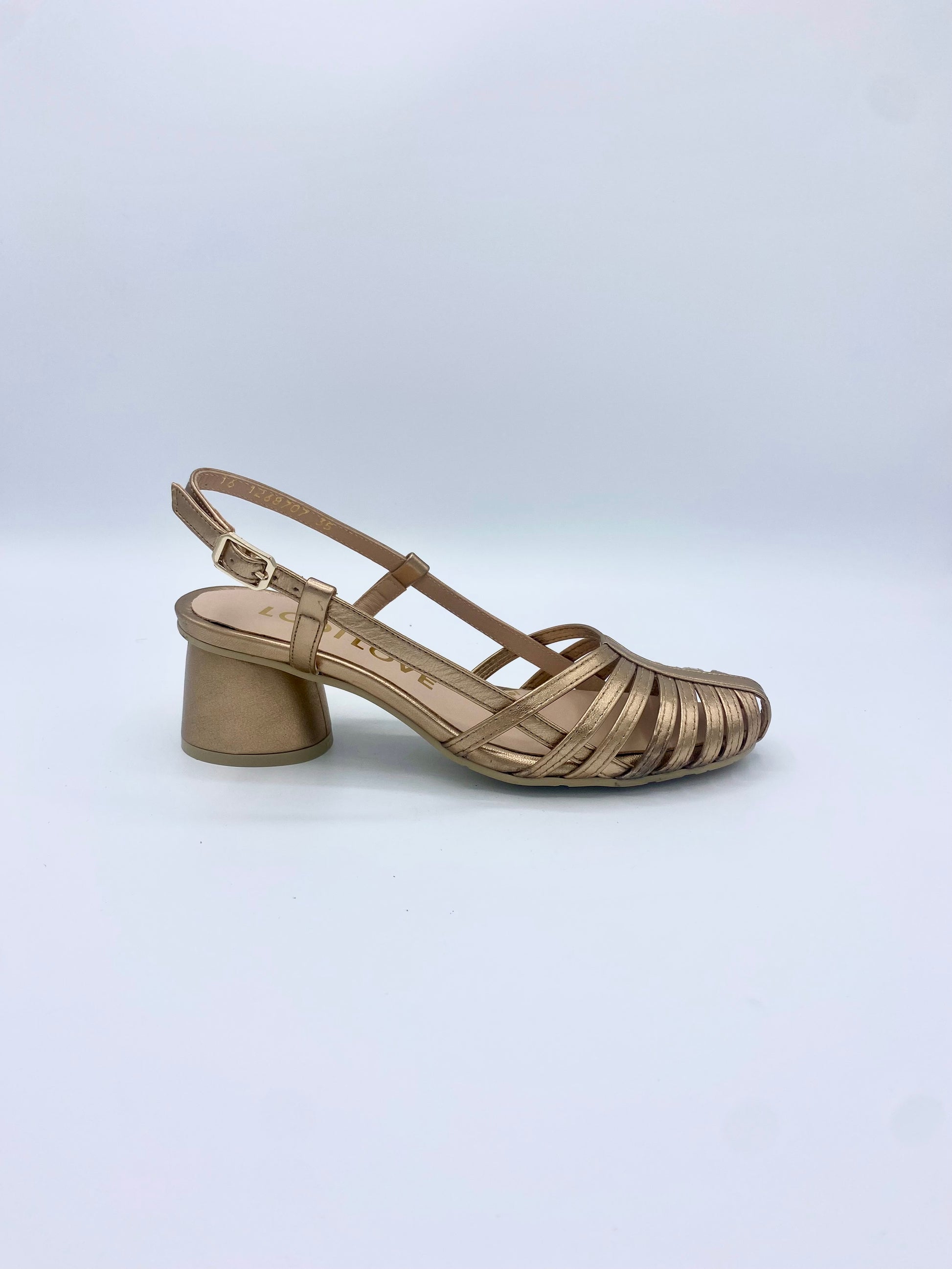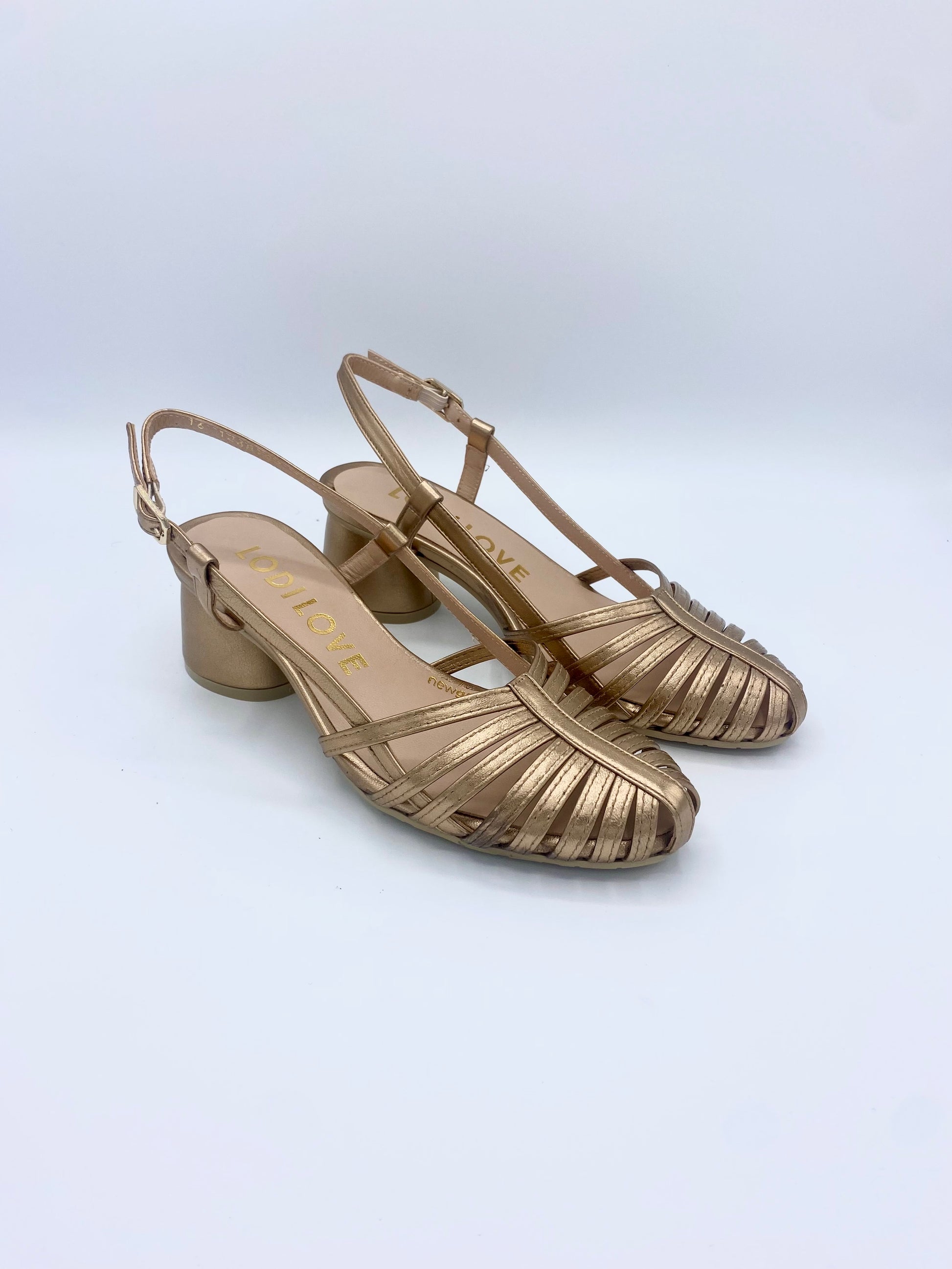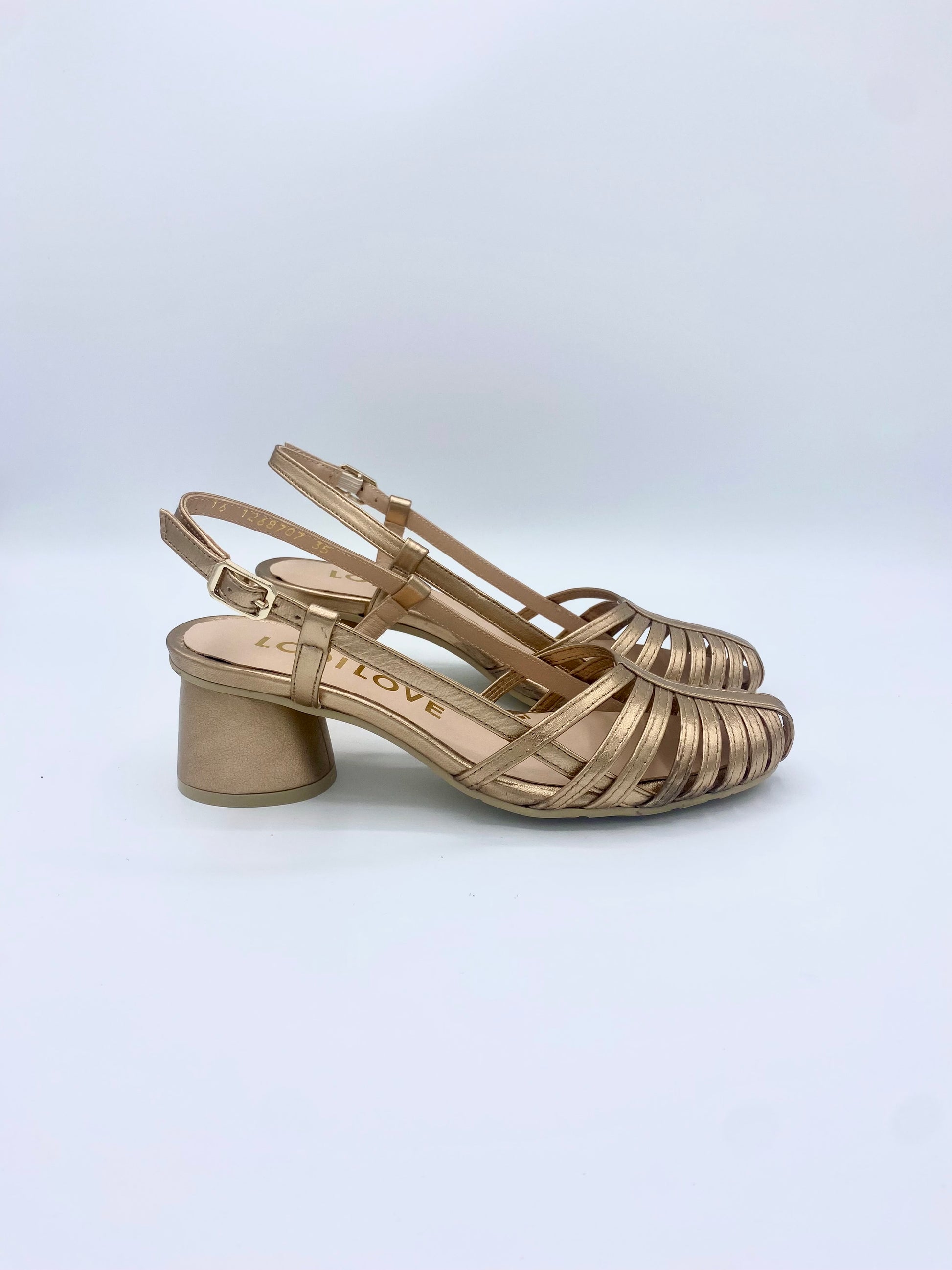 Die zarte Sandle mit dem kleinen Blockabsatz lässt sich in dem dezenten Goldton nicht nur optimal zu jeglichen Farben kombinieren, sondern ist auch ein Allroundtalent