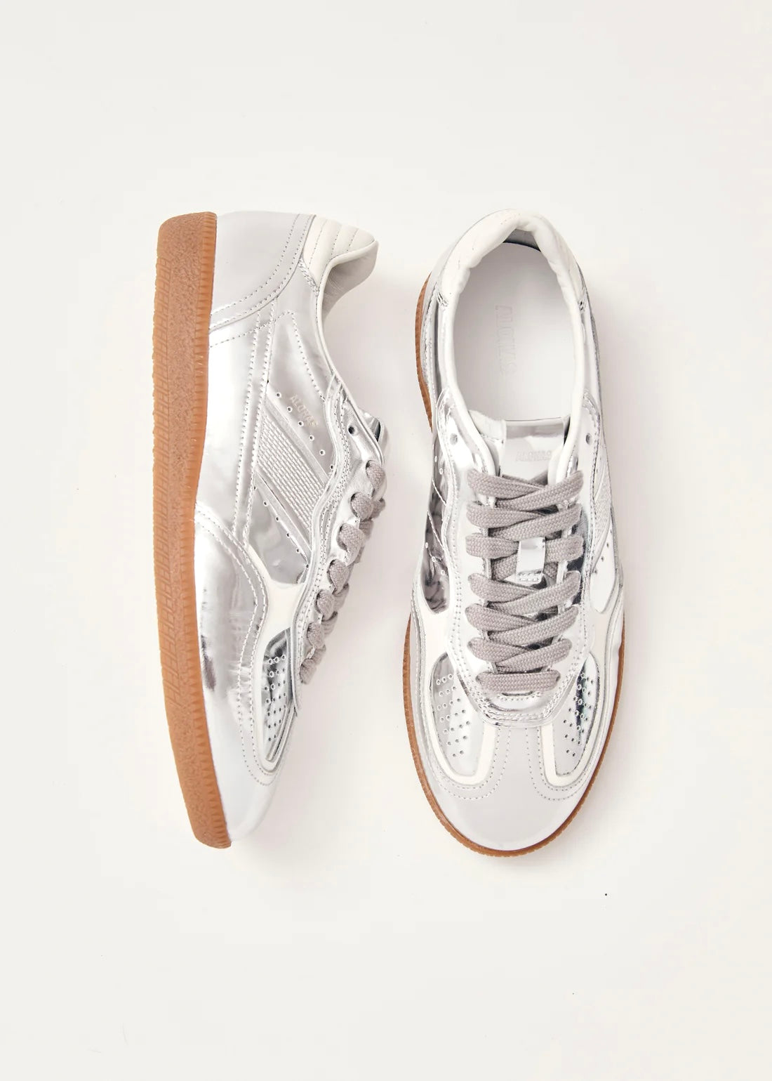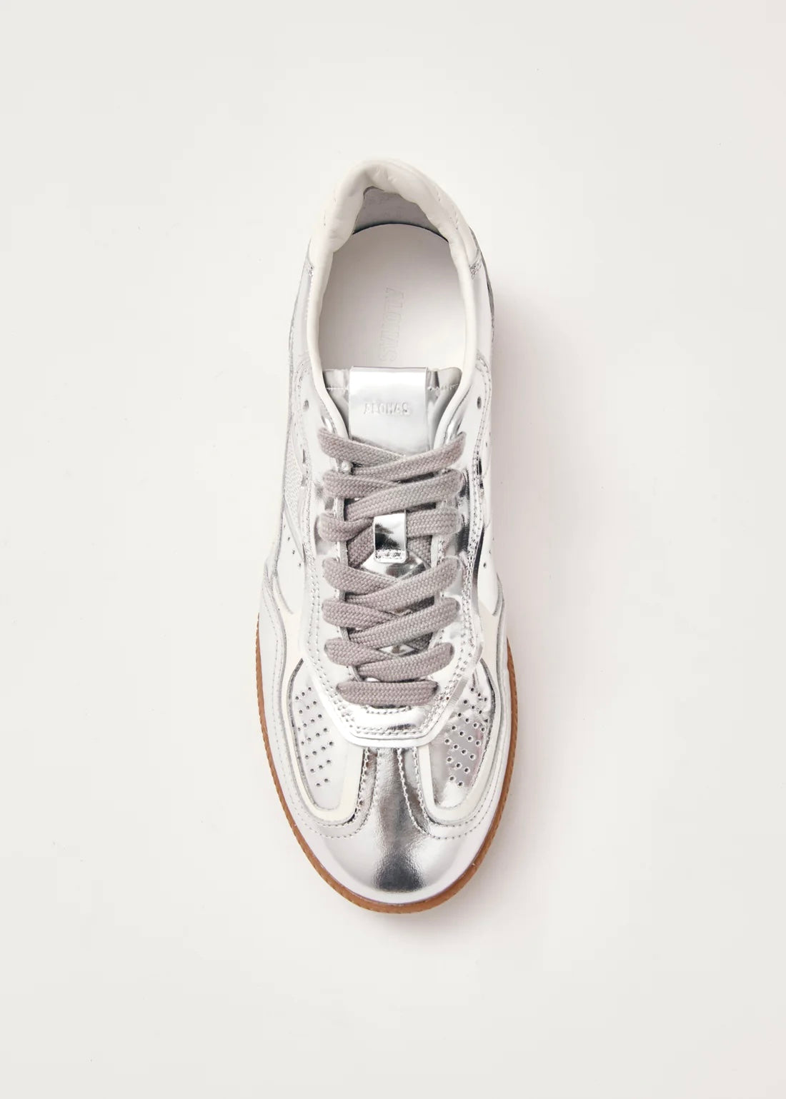 Der silberne Sneaker von ALOHAS ist ein wahrer Hingucker, er wirkt fast wie verspiegelt. Er steht auf einer geriffelten Gummisohle und verfügt über klassische Details wie sichtbare Nähte und einen Logoprint.