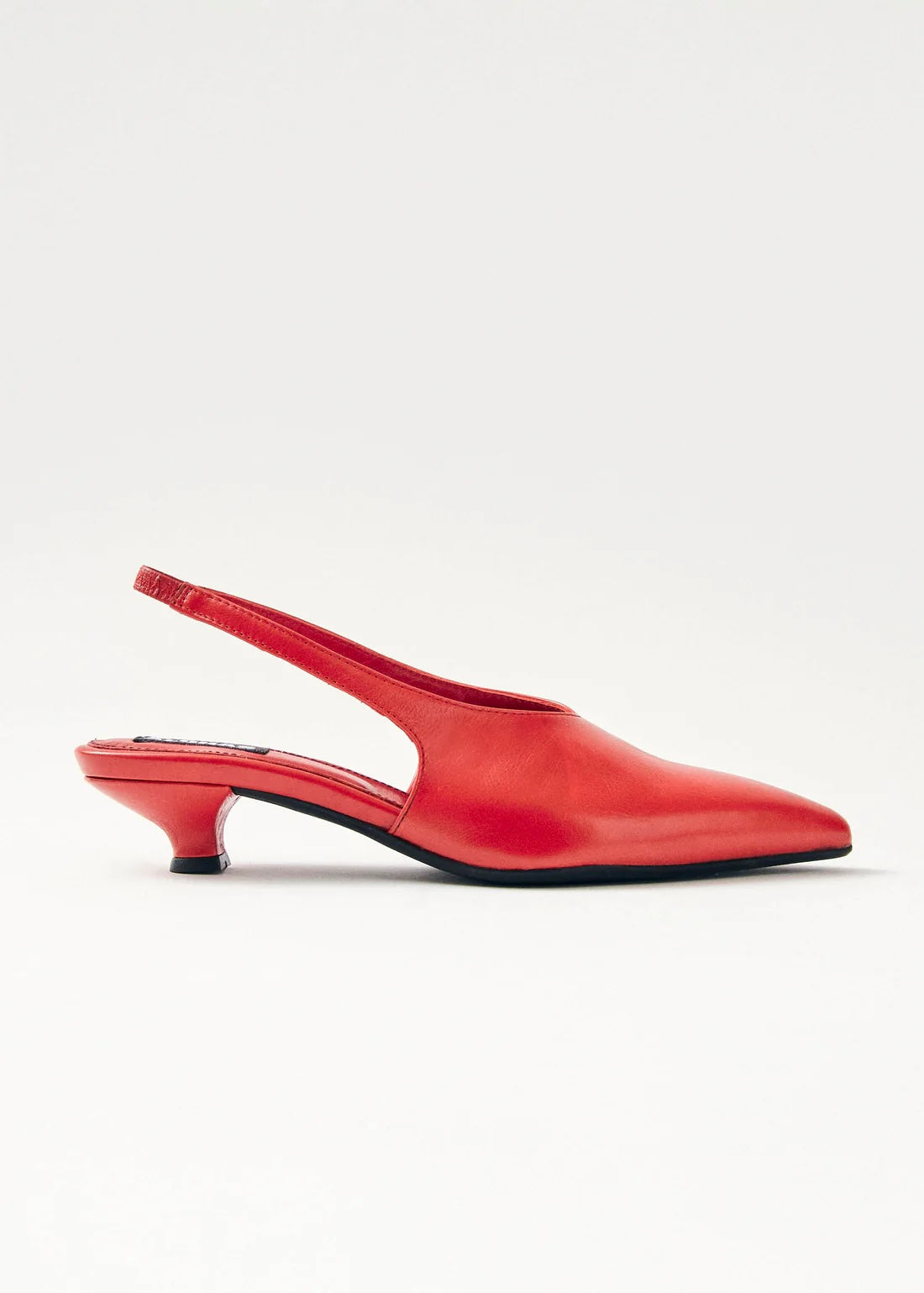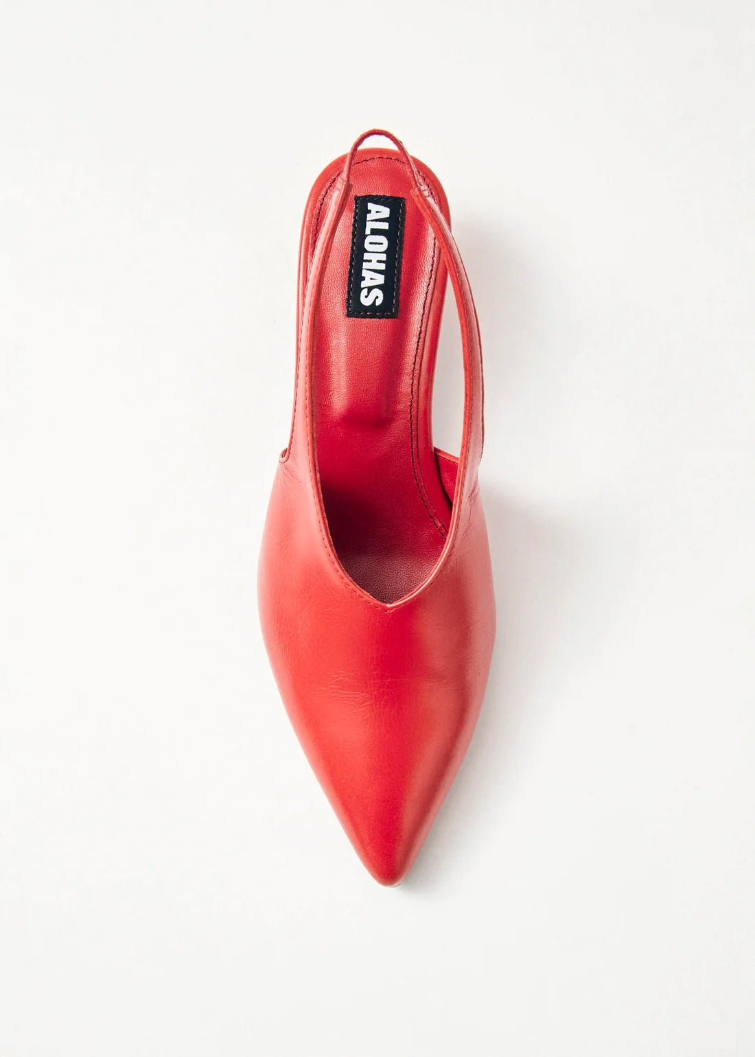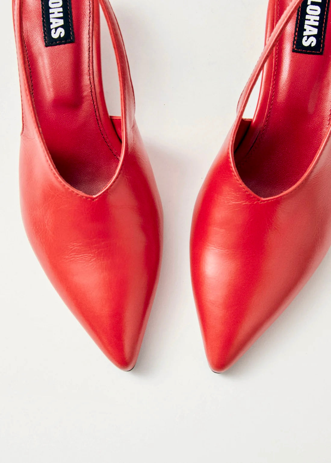 Aus rotem Leder mit Knittereffekt gefertigt, ruhen die Eros-Pumps von ALOHAS auf einem niedrigen 4cm Absatz und verfügen über einen elastischen Slingback-Riemen, der für unverzichtbaren Komfort sorgt. Die scharf zulaufende Spitze und der minimalistische, lange Vamp verleihen der Silhouette eine elegante Note.