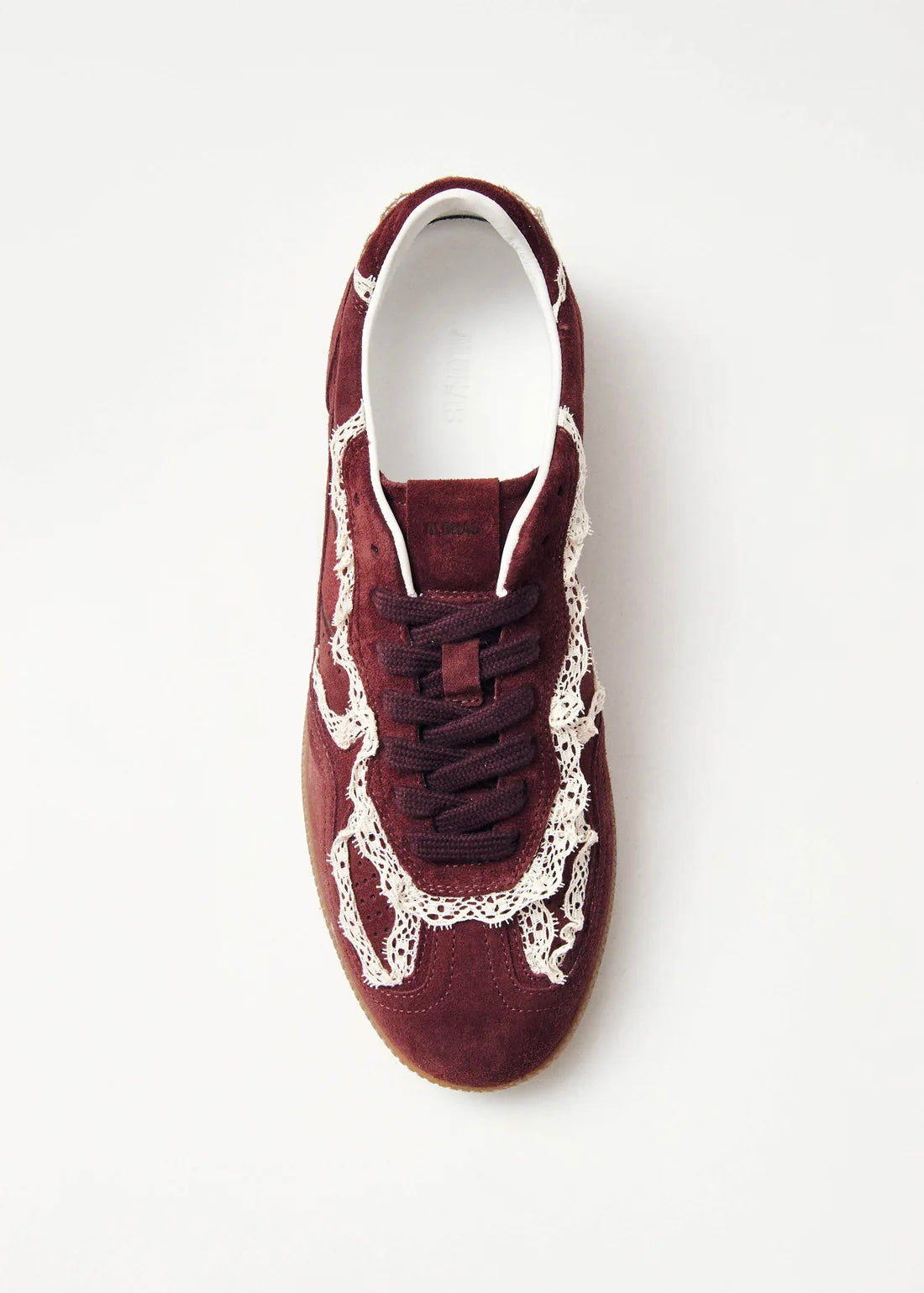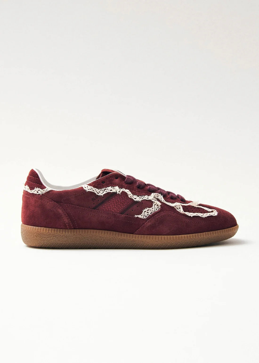 Burgunderrote Wildleder-Sneaker mit Häkelsäumen